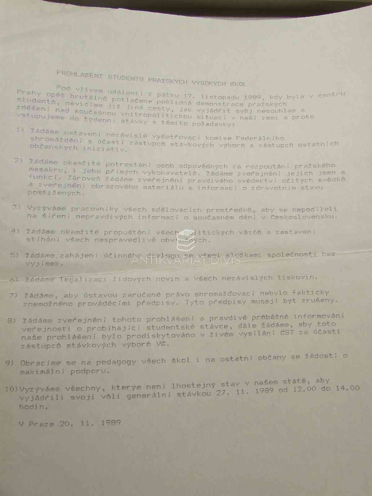 Prohlášení studentů pražských vysokých škol Studenti, pražských vysokých škol neuvedeno, 1989
