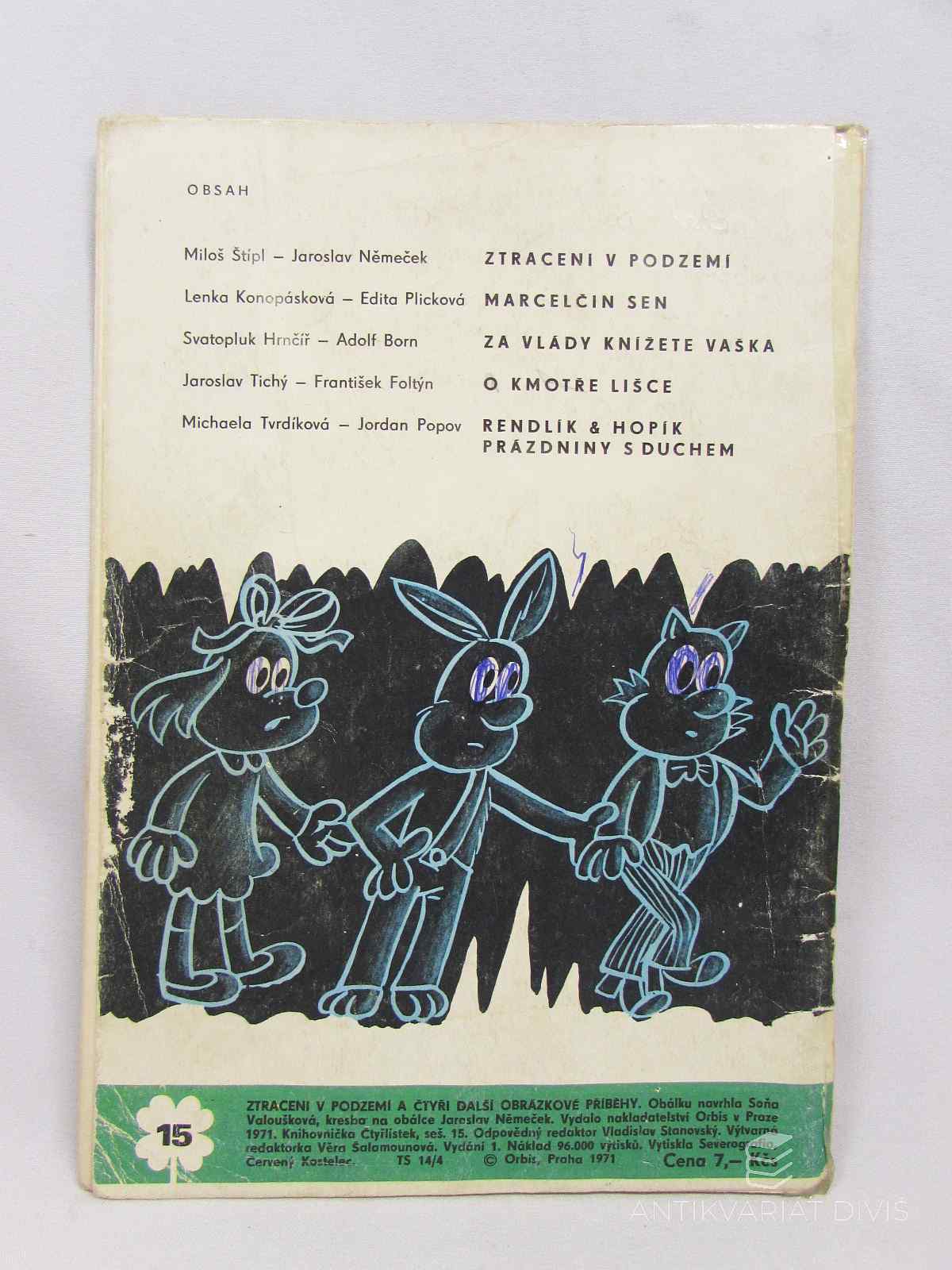 - Čtyřlístek 15: Ztraceni v podzemí, Marcelčin sen, Za vlády knížete, O kmotře lišce, Rendlík & Hopík - Prázdniny s duchem, Komisař Drábek pokračuje, Konpásková Kopta Malát Němeček Hrnčíř Born Foltýn Štípl Tichý Plicková Tvrdíková Popov